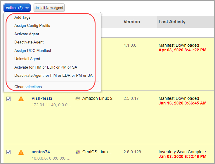 It's easy to take bulk actions on Cloud Agents in one go. Select the checkbox next to agents in your agents list, open the Actions menu and select the action you're interested in. Keep in mind you can search for Cloud Agents using the search box, select all agents matching your search (use the checkbox in the header row), then choose from the Actions menu. Following is the sample screenshot and shows modules to activate or deactivate as per your subscription.