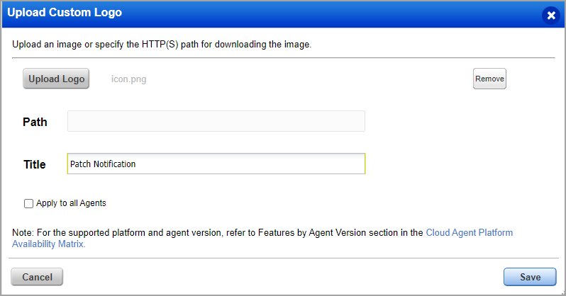 5) Select the Apply to all Agents check box, if you want to apply the customized logo change to the Patch Management notifications for all Windows Cloud Agents in your subscriptions.